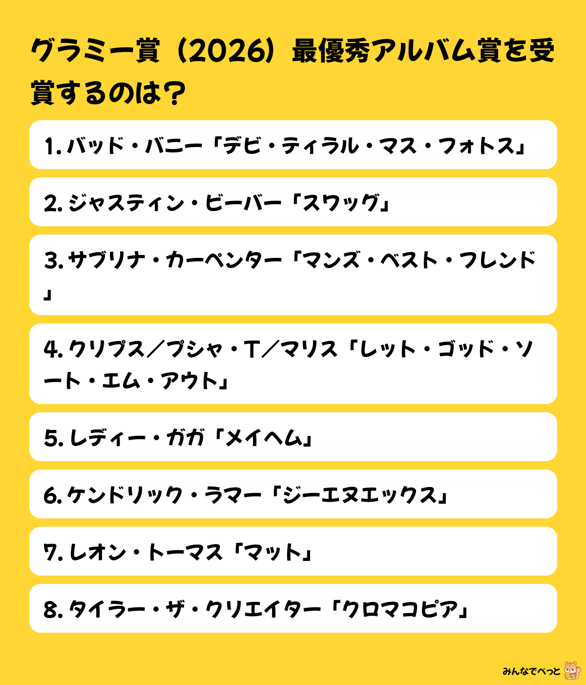 返信:確かに世界観は強いけど、最近は話題性も大きい気がする。ガガやケンドリックに流れる可能性もありそう。