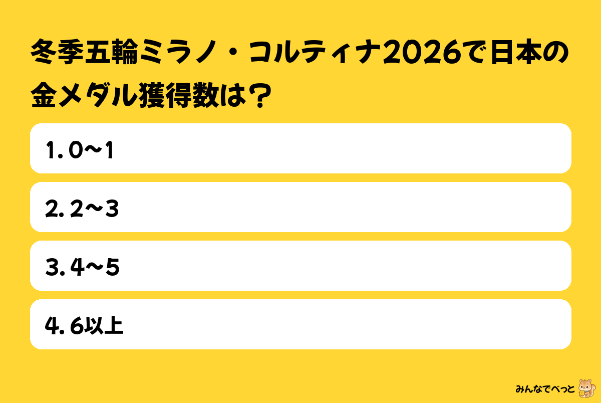 前回の流れ見ると2〜3が現実ライン。雪競技次第で上振れはありそう。