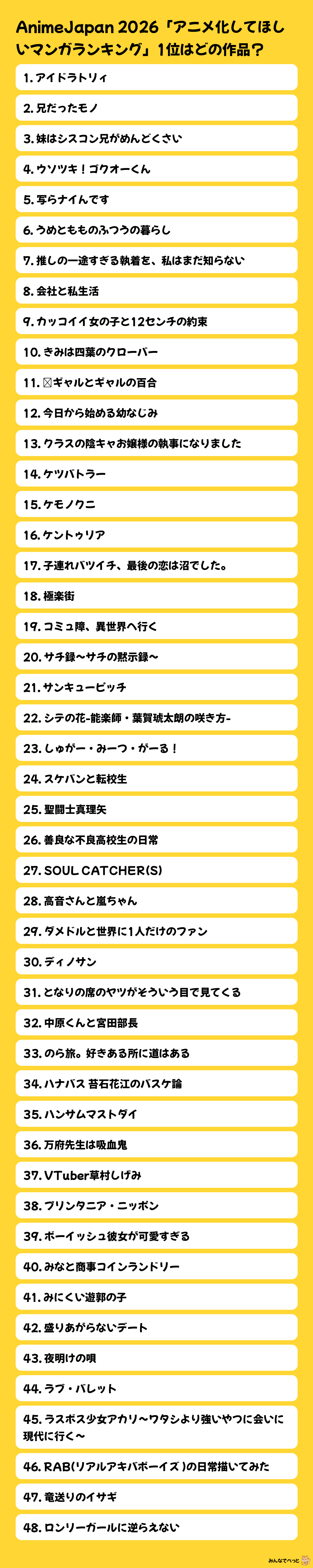 AnimeJapanの一般投票企画「アニメ化してほしいマンガランキング2026」で、最終的に1位に選ばれる作品を当てるお題です。